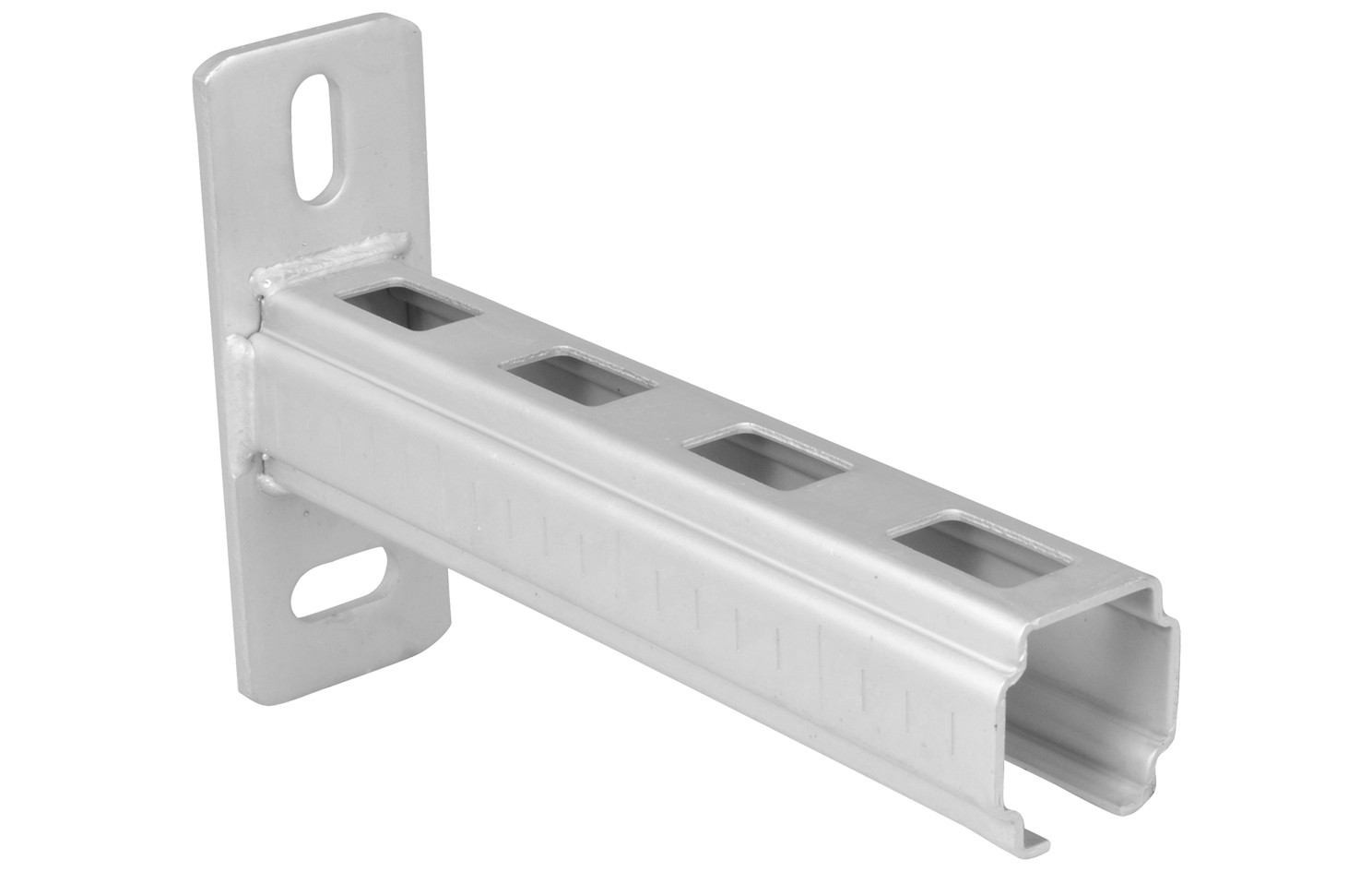 Wandplatte mit angeschweißter C-Profilschiene, auch geeignet zur Befestigung an Decken, Befestigungslöcher sind als Langlöcher um 90° zueinander ausgestanzt, um den Montagekomfort zu verbessern CO2-geschweißt, mit seitlich eingestanzter cm-Skala, Schiene WM15, WM30 und WM35 durch Lochmuster beidseitig zu benutzen, Oberflächenbeschichtung Ultra Protect 1000 Systemtechnologie, ein System für Installationen im Innen-und Außenbereich, besteht min. 1000 Std. Salzsprühtest nach DIN ISO 9227