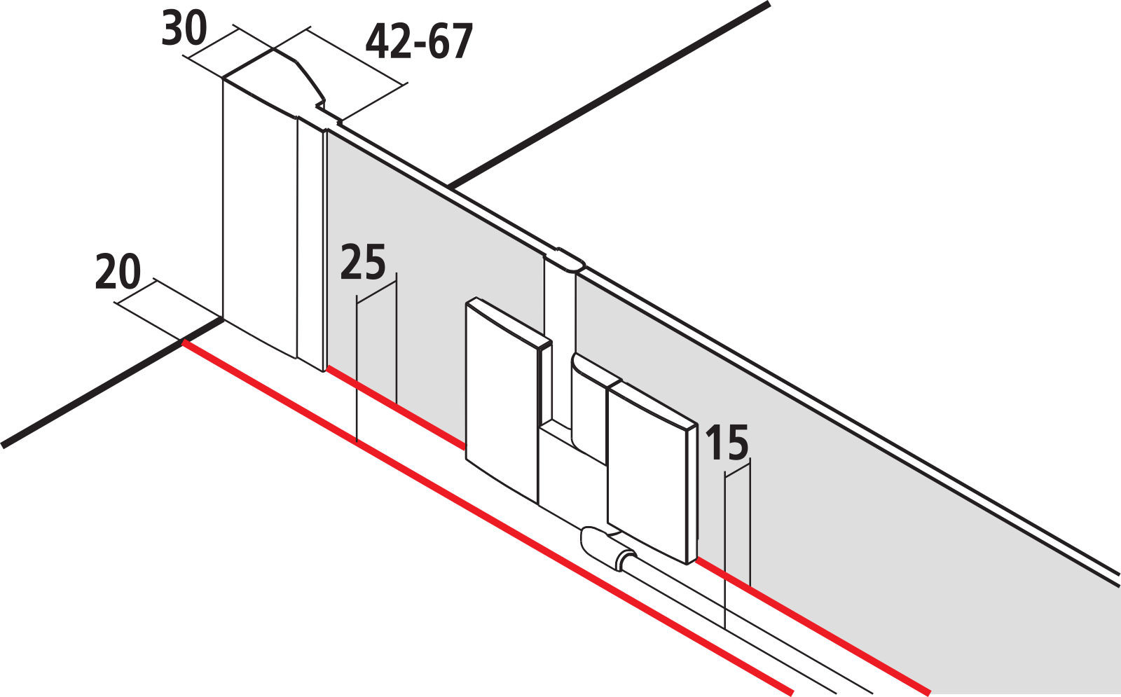 für ungleichschenklige Wannen, Wannentyp A, teilgerahmt, mit zwei Glasflügeln, nach innen und außen öffnend und zwei Festfeldern, mit Stabilisierungen (innen), Glasstärke 6 mm Einscheiben-Sicherheitsglas nach EN 12150, optional mit Pflegeleicht-Beschichtung, Profile aus eloxiertem Aluminium, Beschläge und Griffe aus Metall, Verstellmöglichkeit im Wandprofil 25 mm, Beschläge mit Hebe-Senk-Mechanismus, durchgehende Magnetleisten und Dichtprofile, waagerechte Dichtleiste mit Wasserabpralleffekt, mit 6 mm Bodenschwelle oder ohne Bodenschwelle (bodenfrei) installierbar, mit Befestigungsmaterial und transparentem Handtuchhalter-Haken, geprüft nach DIN EN 14428, die Schräge unter den Festfeldern darf max. 2 mm betragen
