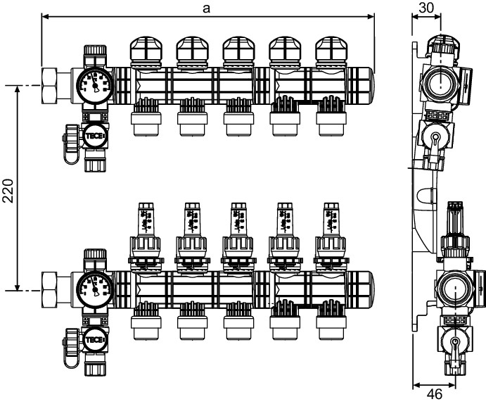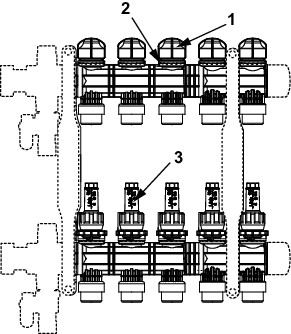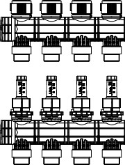 modular erweiterbar, Heizkreisabgänge in 3/4" Eurokonus, Vorlauf mit voreinstellbaren Durchflussanzeigern bis 3,5 l/min, Rücklauf mit integrierten Ventileinsätzen M 30 x 1,5 mm.
