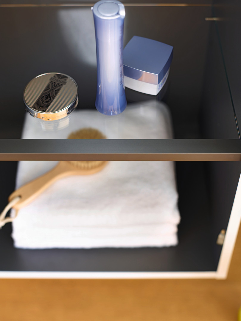3 Glasfachboden mit Aluträgersystem, min. Wandabstand von 5 cm einhalten, auch beim Anbau an Möbel min. 5 cm einhalten, geeignet für Sockelfüße UV 9991/9993, wenn 4 Füße gewünscht 2x 2 Füße bestellen