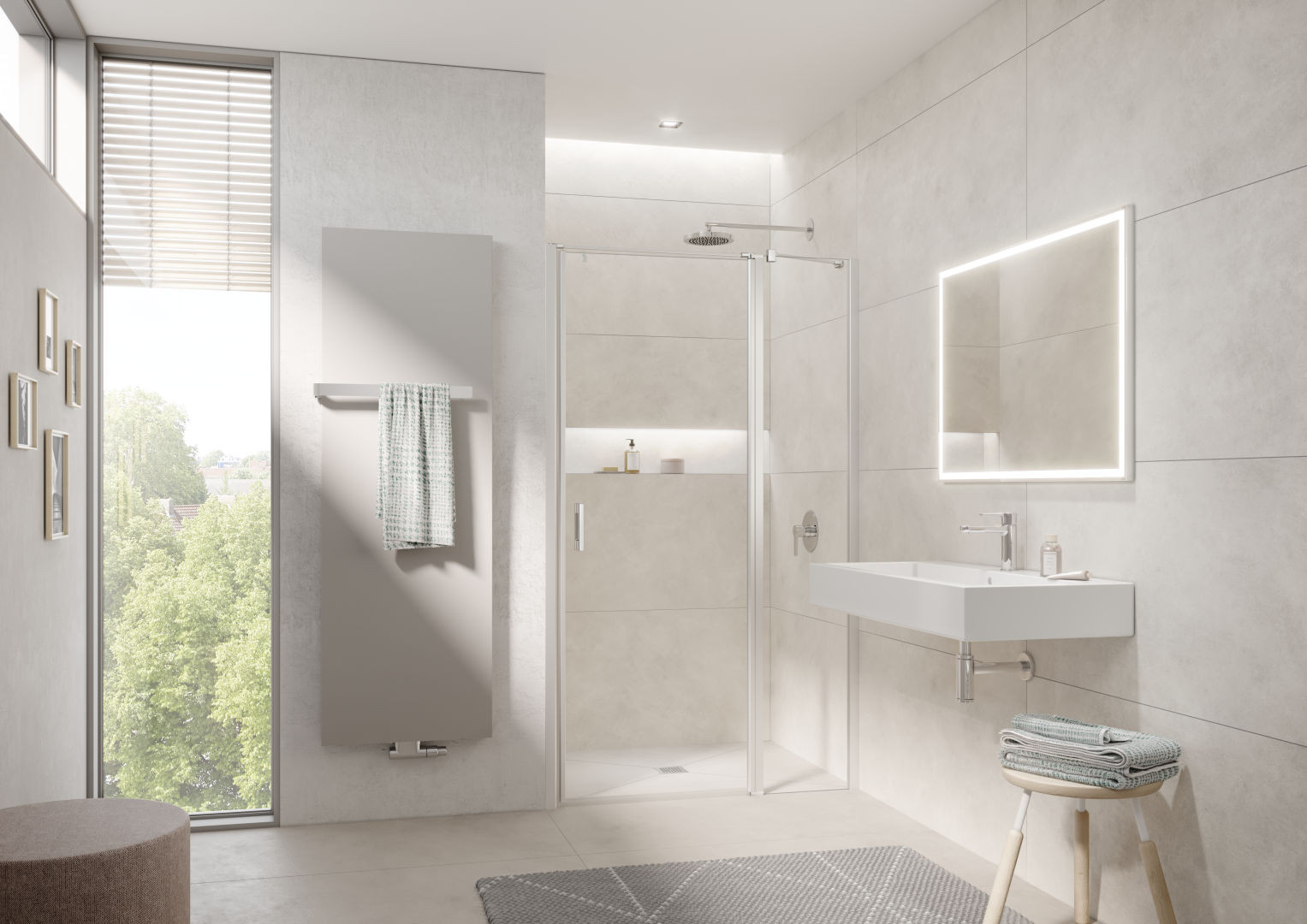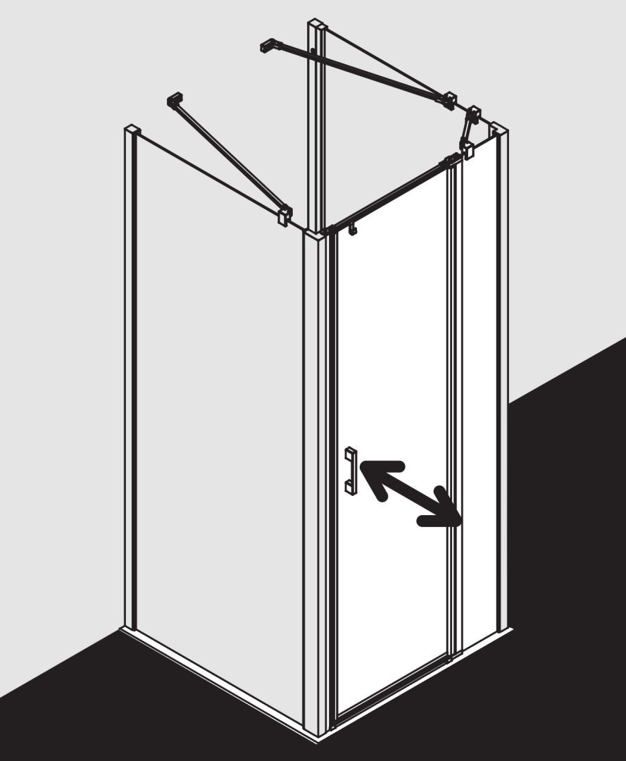 zum Einbau in einer Nische und zur Konbination mit LI TWD Seitenwand/LI TVD Seitenwand verkürzt auf Badewanne, teilgerahmt, mit einem Glasflügel, nach innen und außen öffnend, mit einem Festfeld, mit Zugstab und Stabilisierung (innen), ohne Zugstab installierbar, Ecke ohne Zugstab mit LI TWD und zusätzlicher Liga-Stabilisierung (innen) ZDSS VSS LI, Glasstärke 5 mm Einscheiben-Sicherheitsglas nach EN 12150, optional mit Pflegeleicht-Beschichtung, Profile aus eloxiertem Aluminium, Griffe und Gelenke aus Metall, bei Oberfläche silber mattglanz Griffe, Gelenke und Anschlüsse für Zugstab und Bodenschwelle in chrom, Verstellmöglichkeit je Wandprofil 25 mm, Gelenk mit Hebe-Senk-Mechanismus, durchgehende Magnetleisten und Dichtprofile, waagerechte Dichtleiste mit Wasserabpralleffekt, 6 mm Bodenschwelle, mit Befestigungsmaterial und transparentem Handtuchhalter-Haken, geprüft nach DIN EN 14428, waagerechte Schräge darf max. 5 mm betragen