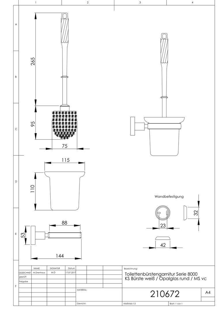 ASW Toilettenbürstengarnitur Serie 8000 Messing verchromt, Stiel KS vc/Bürste weiß, Opalglas rund FC210660