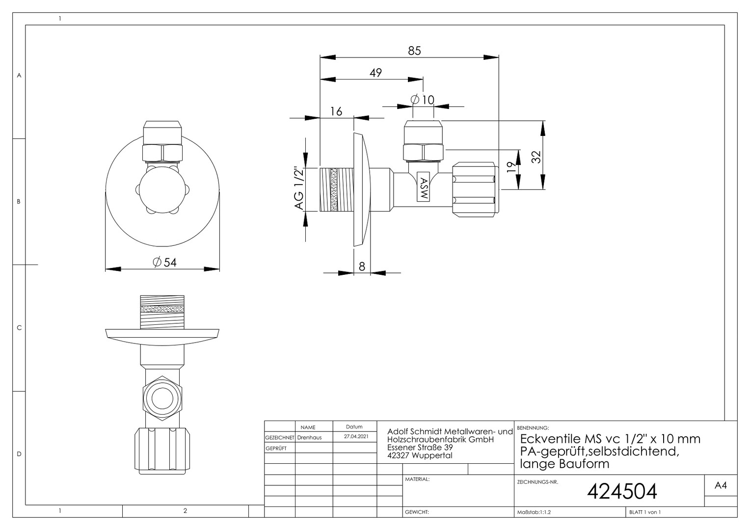 ASW Eckventil 1/2" x 10 mm, lange Bauform, selbstdichtend, Messing verchromt, PA-geprüft ASW424504