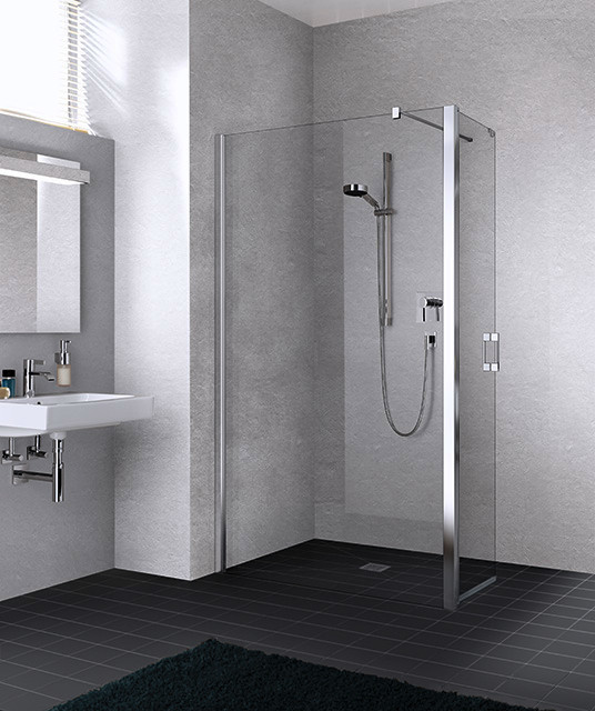 Kermi Seitenwand Walk-In LIGA mit beweglichem Flügel 83 x 185 cm, rechts, silber hochglanz, ESG klar, auf Duschplatz ZKLIT1R08318VAK