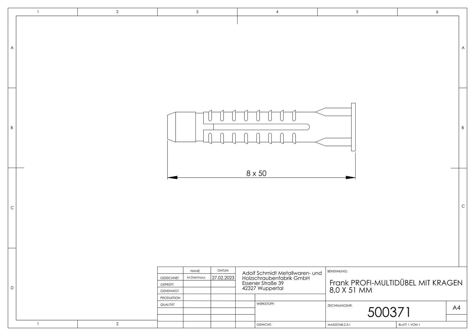 FRANK Profi-Verknotungsdübel mit Kragen, Ø 8 x 50 mm, für Ø 4,5-6,0 mm ASW500371