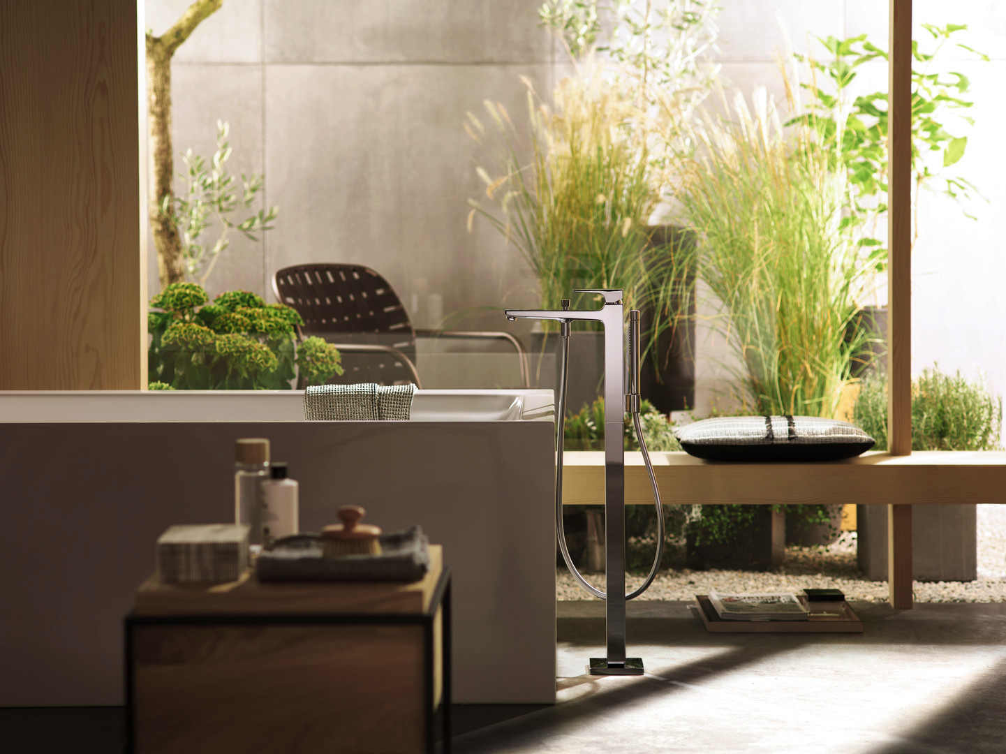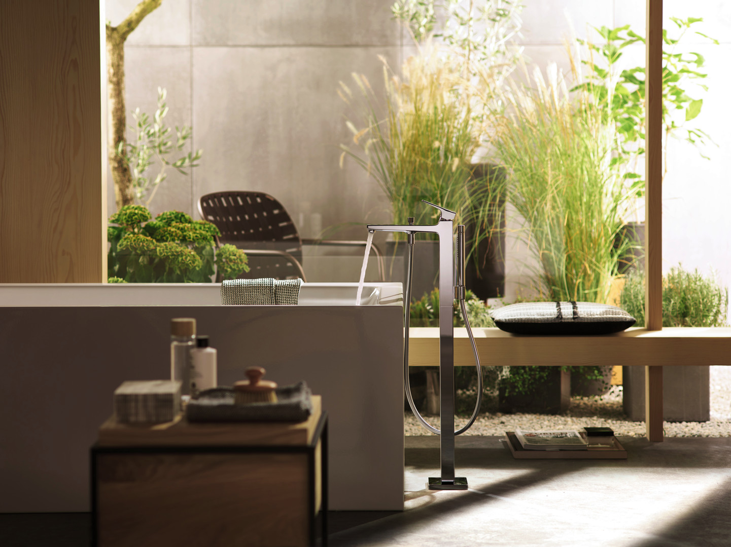 bestehend aus Einhebel-Wannenmischer, bodenstehend, Stabhandbrause, Brauseschlauch, Brausehalter, 2 Verbraucher, Strahlart Armatur: Normalstrahl, Strahlart Handbrause: Rain, MonoRain, max. Durchflussmenge bei 3 bar: 20 l/min, Durchfluss für Wanneneinlauf bei 3 bar 20 l/min, Keramikmischsystem, Betriebsdruck min. 1/max. 10 bar, Temperaturbegrenzung einstellbar, Umsteller mit automatischer Rückstellung, Rückflussverhinderer, Anschlussgröße DN 15, Anschlussart Grundkörper, Air Power Technologie, Quick Clean Antikalksystem