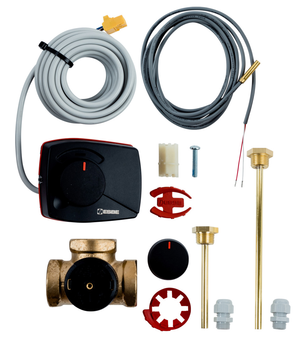 für hydraulisch optimal abgestimmten Betrieb eines Wärmeerzeugers mit Pufferspeicher SPU-2 und WOLF Wohnungstationen CAT, bestehend aus 1x Temperaturfühler 6 mm NTC 5K, 1x Solar-Speicher-Tauchhülse 1/2”, 1x Tauchhülse 1/2" 200 mm Kabelvers., 3-Wege-Mischer aus Messing mit Motor 230 V, 120 s/90 Grad, 6 Nm (Ansteuerung über Kaskadenmodul)