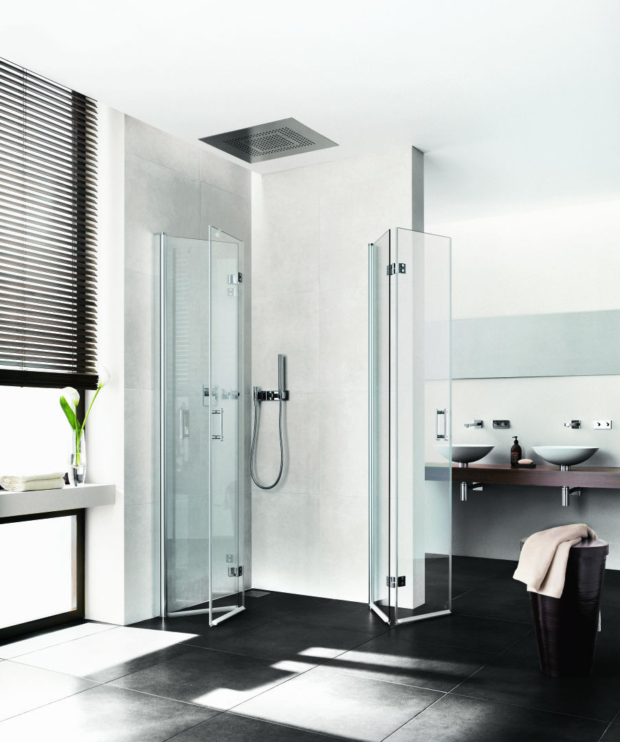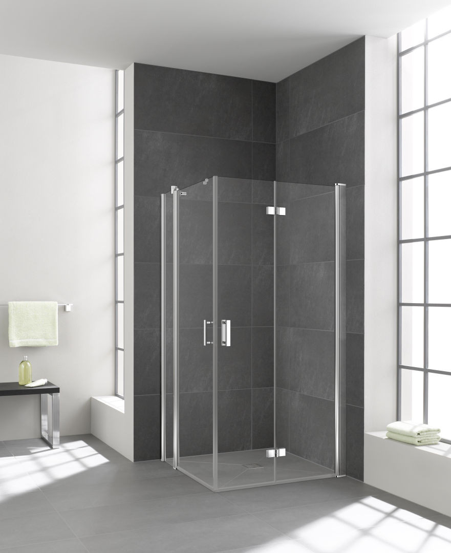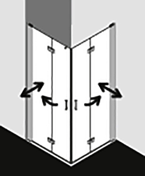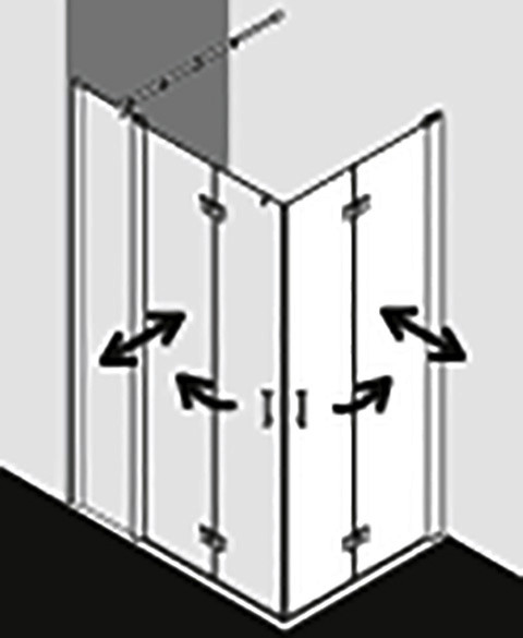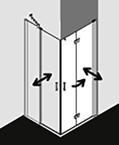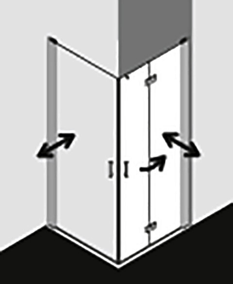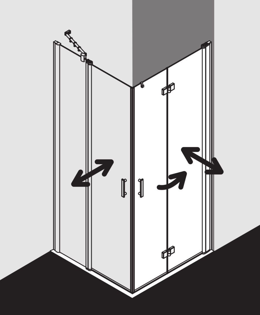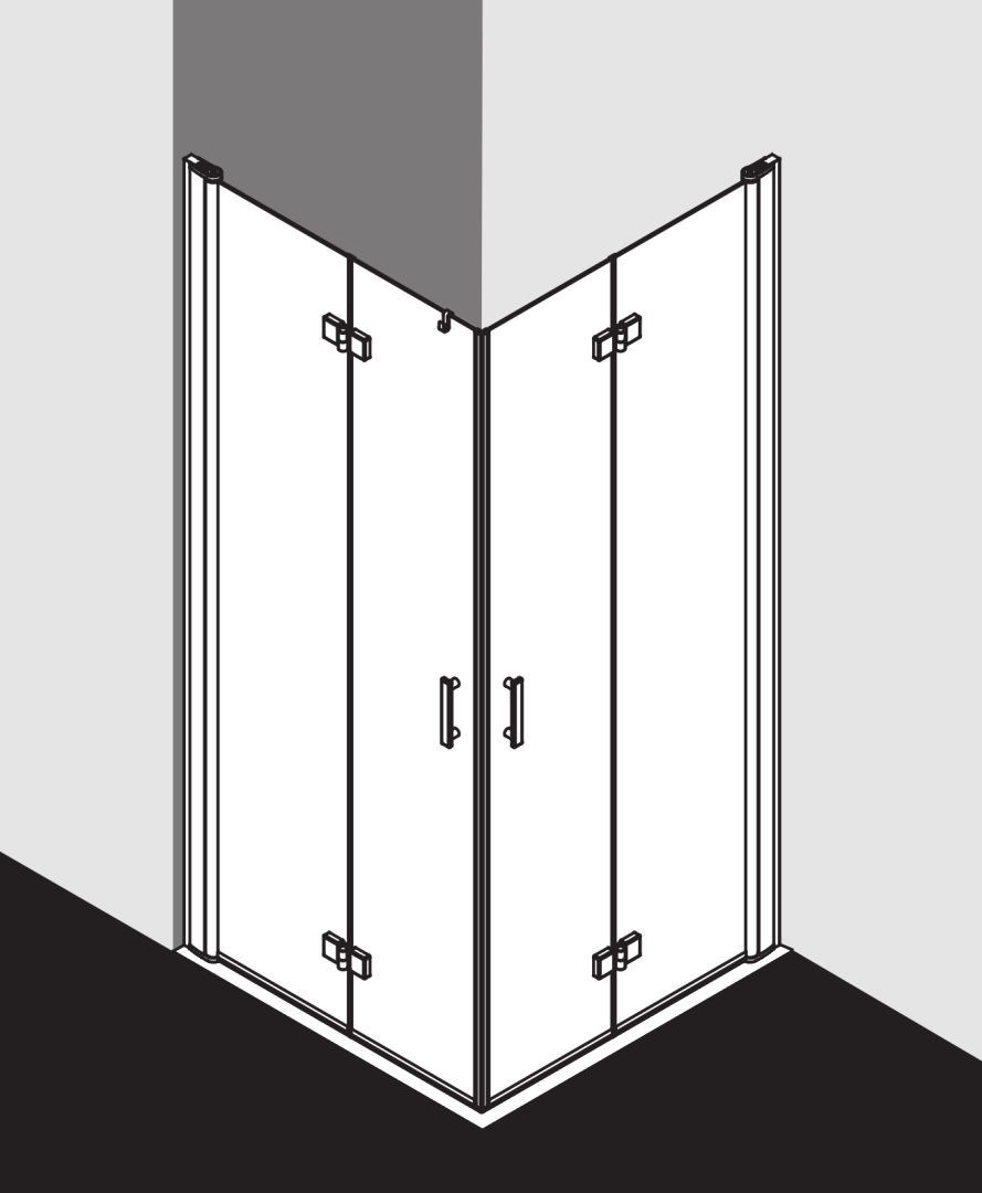 kompletter Eckeinstieg bestehend aus DI 2CR Eckeinstieg 2-teilig (Pendel-Falttüren) Halbteil rechts, DI 2CL Eckeinstieg 2-teilig (Pendel-Falttüren) Halbteil links, Halbteile unterschiedlicher Breite beliebig kombinierbar, Kombination mit DI 1ER/L Eckeinstieg (Pendeltür) Halbteil/DI EPR/L Eckeinstieg 2-teilig (Pendeltür mit Festfeld) Halbteil/DI F2R/L Eckeinstieg 2-teilig (Pendel-Falttür mit Festfeld) Halbteil möglich, teilgerahmt, mit vier Glasflügeln, im Wandgelenkprofil 90° nach innen und außen schwenkbar, im Beschlagsgelenk 180° nach außen schwenkbar, Glasstärke 6 mm Einscheiben-Sicherheitsglas nach EN 12150, optional mit Pflegeleicht-Beschichtung, Profile aus eloxiertem Aluminium, Beschlagsgelenke und Griffe aus Metall, Verstellmöglichkeit im Wandgelenkprofil 20 mm, Wandgelenkprofile mit Hebe-Senk-Mechanismus, Beschlagsgelenke mit Hebe-Senk-Mechanismus und innen bündig mit der Glasoberfläche, durchgehende Magnetleisten und Dichtprofile, waagerechte Dichtleiste mit Wasserabpralleffekt, 6 mm Bodenschwelle, mit Befestigungsmaterial und transparentem Handtuchhalter-Haken, geprüft nach DIN EN 14428, waagerechte Schräge darf max. 5 mm betragen, Höhe mit Wandgelenkprofil 2017 mm