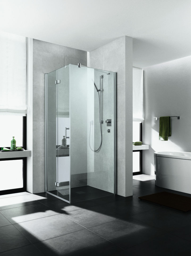 kombinierbar mit DI 2SR/L Pendel-Falttür, teilgerahmt, mit Stabilisierung (innen), Glasstärke 6 mm Einscheiben-Sicherheitsglas nach EN 12150, optional mit Pflegeleicht-Beschichtung, Profile aus eloxiertem Aluminium, Verstellmöglichkeit im Wandprofil 20 mm, durchgehende Magnetleiste, mit Befestigungsmaterial, geprüft nach DIN EN 14428, waagerechte Schräge darf max. 5 mm betragen, rechts und links verwendbar