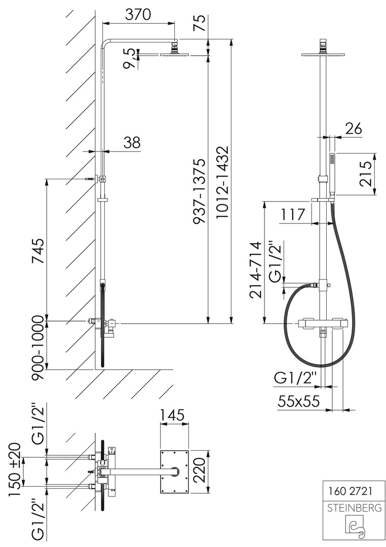 Steinberg Brauseset Serie 160 mit AP-Thermostatarmatur, Regen-/Handbrause, Matt Black ST1602721S