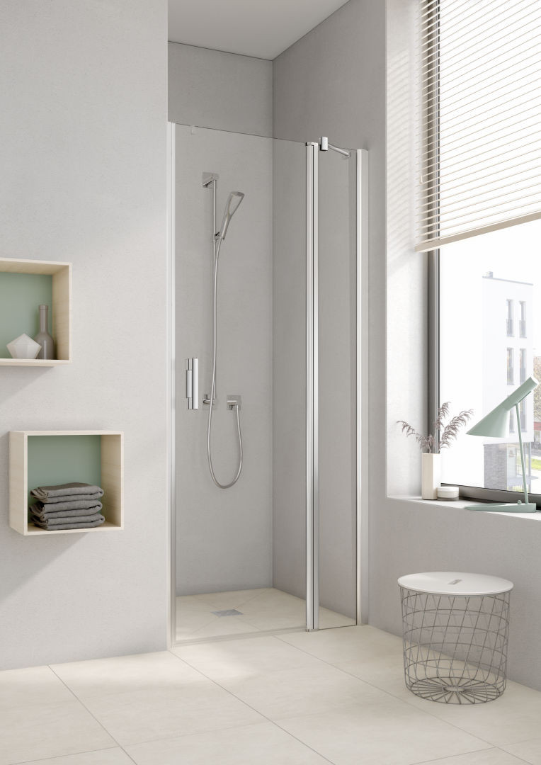 Kermi Pendeltür Pega 1-flügelig mit Festfeld 80 x 185 cm, silber hochglanz, ESG klar Clean, rechts ZKPE1GR08018VPK