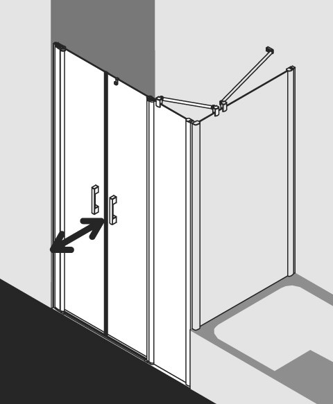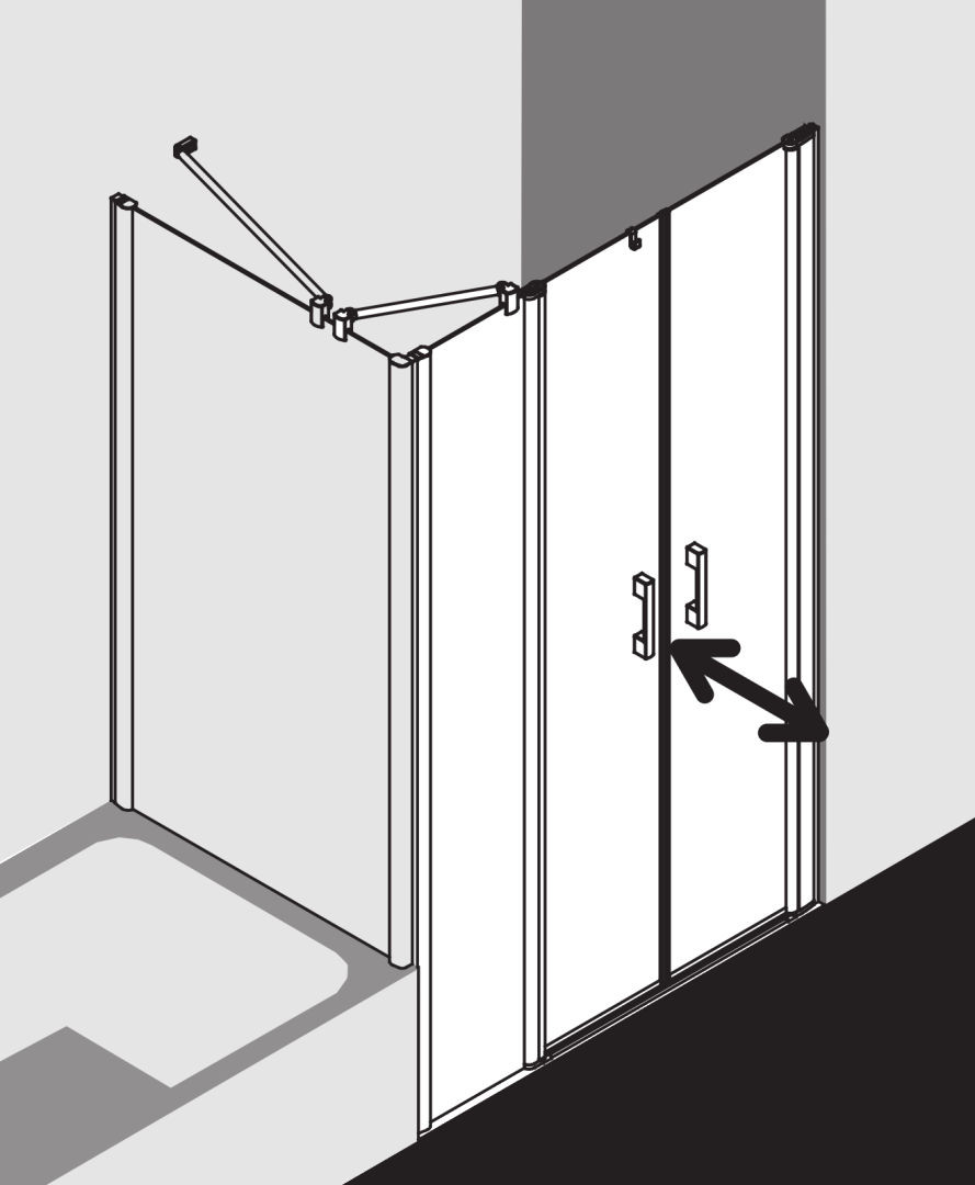 zum Einbau in einer Nische und zur Kombination mit PE TWD Seitenwand/PE TVD Seitenwand verkürzt auf Badewanne, teilgerahmte Tür mit zwei Glasflügeln, nach innen und außen öffnend, mit einem Festfeld und PEGA-Stabilisierung (innen), Verglasung mit 6 mm Einscheiben-Sicherheitsglas nach EN 12150, optional mit Pflegeleicht-Beschichtung, Profile aus eloxiertem Aluminium, Griffe aus Metall, Verstellmöglichkeit je Wandprofil 25 mm, Türprofil mit Hebe-Senk-Mechanismus, durchgehende Magnetleisten und Dichtprofile, waagerechte Dichtleiste mit Wasserabpralleffekt, mit Bodenschwelle (Höhe 6 mm), mit Befestigungsmaterial, ein transparenter Handtuchhalter-Haken, geprüft nach DIN EN 14428, Schräge waagerecht max. 5 mm
