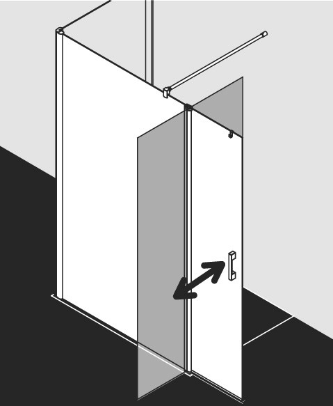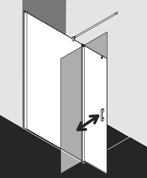teilgerahmte Walk-In Glasanlage mit beweglichem Flügel, 90° nach innen und außen schwenkbar, mit Wandbefestigung, 90° Stabilisierung, Verglasung mit 6 mm Einscheiben-Sicherheitsglas nach EN 12150, optional mit Pflegeleicht-Beschichtung, Profile aus eloxiertem Aluminium, Griffe aus Metall, Stabilisierung aus eloxiertem Aluminium, Verstellmöglichkeit im Wandprofil 25 mm, Flügelprofil mit Hebe-Senk-Mechanismus, durchgehende Dichtprofile und waagerechte Dichtleiste mit Wasserabpralleffekt, ohne Bodenschwelle (bodenfrei) installierbar, mit Befestigungsmaterial, ein transparenter Handtuchhalter-Haken, geprüft nach DIN EN 14428, Schräge waagerecht max. 5 mm, kürzen der Stabilisierung (Länge 1220 mm) bauseits möglich