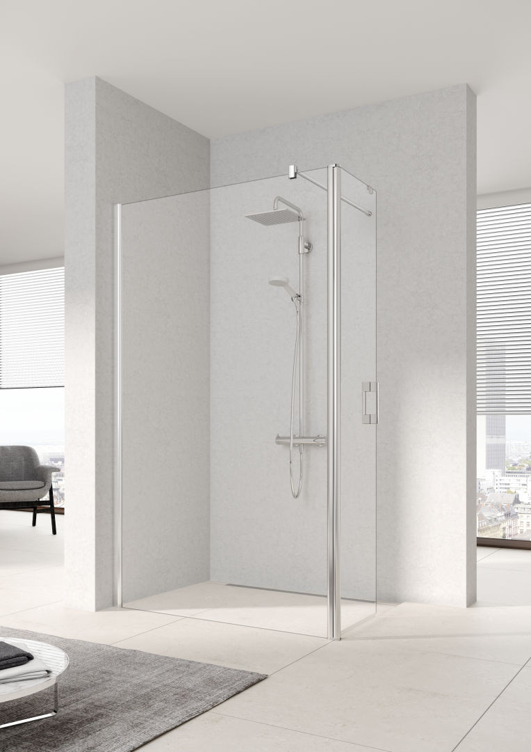 Kermi Seitenwand Walk-In Pega mit beweglichem Flügel 123 x 185 cm, silber hochglanz ESG SR Opaco, links, auf Duschplatz