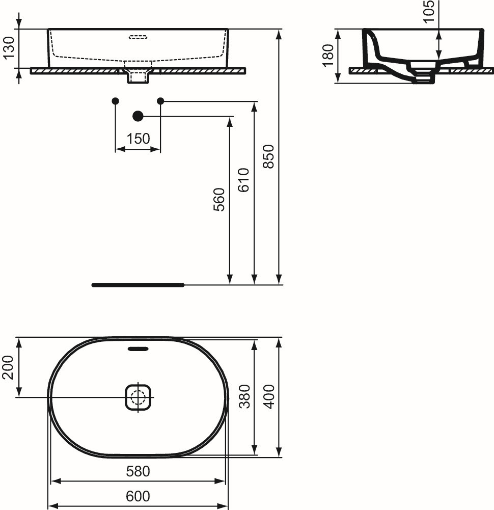 Ideal-Standard Aufsatzwaschtisch Strada II 60x40x18cm, ohne Hahnloch, mit Überlauf, weiß