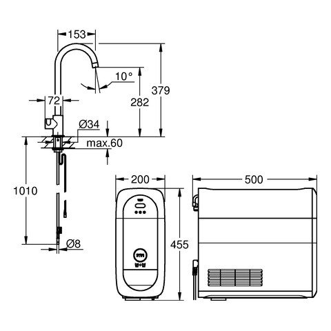 mit Filterfunktion, Einlochmontage, Drucktasten für 3 gefilterte und gekühlte Tafelwasserarten, still, medium, sprudelnd, Long-Life Oberfläche, schwenkbarer Rohrauslauf, Schwenkbereich 150°, Blue Home Kühler liefert 3 l gekühltes, sprudelndes Wasser pro Stunde, 180 Watt Kühleinheit, 230 V, 50 Hz, Lautstärke im Standby Betrieb 44 dB(A), Schutzart IP 21, benötigt Ventilationsöffnungen im Boden des Küchenschranks, Anzeige und Überwachung von Verbrauchsdaten, Filter- bzw. CO2-Kapazität über Watersystems App, Push Benachrichtigung bei niedriger Filter- bzw. CO2-Kapazität, mit Bluetooth 4.0 und WIFI Datenkommunikation für Apple und Android Geräte, Reichweite bis zu 10 m abhängig von Wand- und Bodenbelägen, für Blue Filter S-Size, Filterkopf mit flexibler Wasserhärteeinstellung für Regionen mit Wasserhärte über 9° dKH, für Regionen mit Wasserhärte unter 9° dKH bitte Aktivkohlefilter 40 547 001 bestellen, passende Filter: Blue Filter S-Size, M-Size, Blue Aktivkohlefilter, Blue UltraSafe Filter und Blue Magnesium und Zink Filter, Blue 425 g CO2-Flasche enthält Komponente, welche als Gefahrstoff gilt