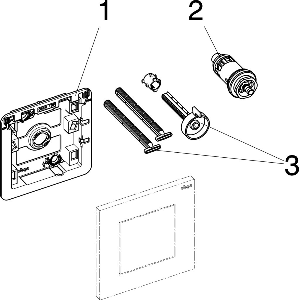 mit Befestigungsrahmen, Betätigungsstifteset, Befestigungsbolzen und Kartuschenventil, für Urinal-Spülsystem, aus Kunststoff, manuelle Spülauslösung von vorn