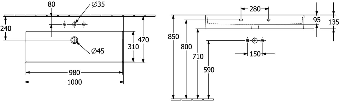 Rechteck, für 3-Loch Armatur geeignet, mittleres Hahnloch durchgestochen, mit Überlauf, EN 31, EN 14688