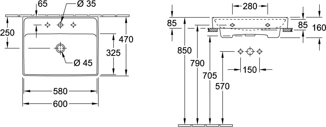 V&B Waschtisch Collaro 60 x 47 cm, mit Überlauf, Unterseite geschliffen, weiß VB4A336G01
