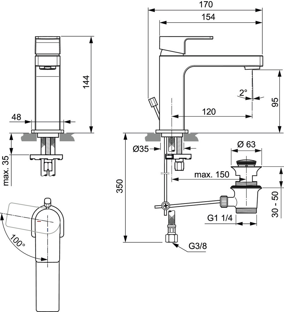DN 15, Auslaufhöhe 95 mm, Luftsprudler (sichtbar), Metall-Zugknopf-Ablaufgarnitur G 1 1/4, flexible Anschlussschläuche G 3/8, Griff aus Metall mit Rot-/Blau-Markierung, Schnellmontagesystem, Kartusche Ø 28 mm, Kartusche mit keramischen Dichtscheiben, Kartuschenschwenkbereich 100°, Norm DIN EN 248, Geräuschverhalten DIN 4109 Gruppe 1, Lebensdauer DIN EN 817