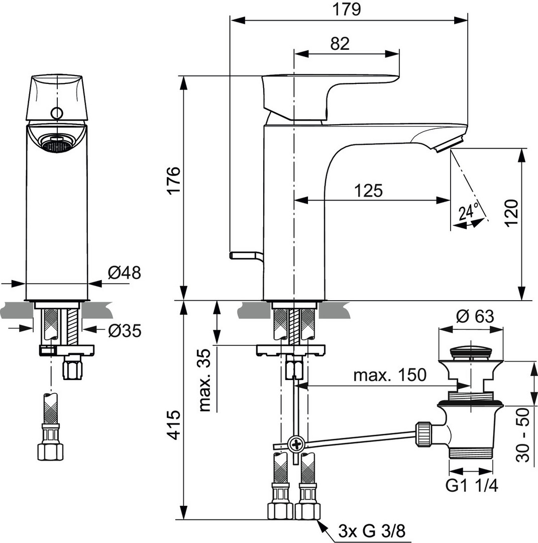 DN 15, Ausladung 125 mm, Auslaufhöhe 120 mm, Luftsprudler (sichtbar), Metall-Zugstangen-Ablaufgarnitur G 1 1/4, flexible Anschlussschläuche G 3/8, Griff aus Metall mit Rot-/Blau-Markierung, Schnellmontagesystem, Kartusche Ø 38 mm, Kartusche mit keramischen Dichtscheiben, Kartuschenschwenkbereich 100°, Kartuschenübersetzung aus Edelstahl, Heißwassertemperaturbegrenzer, Norm DIN EN 248, Geräuschverhalten DIN 4109 Gruppe 1, Lebensdauer DIN EN 817, DIN EN 200