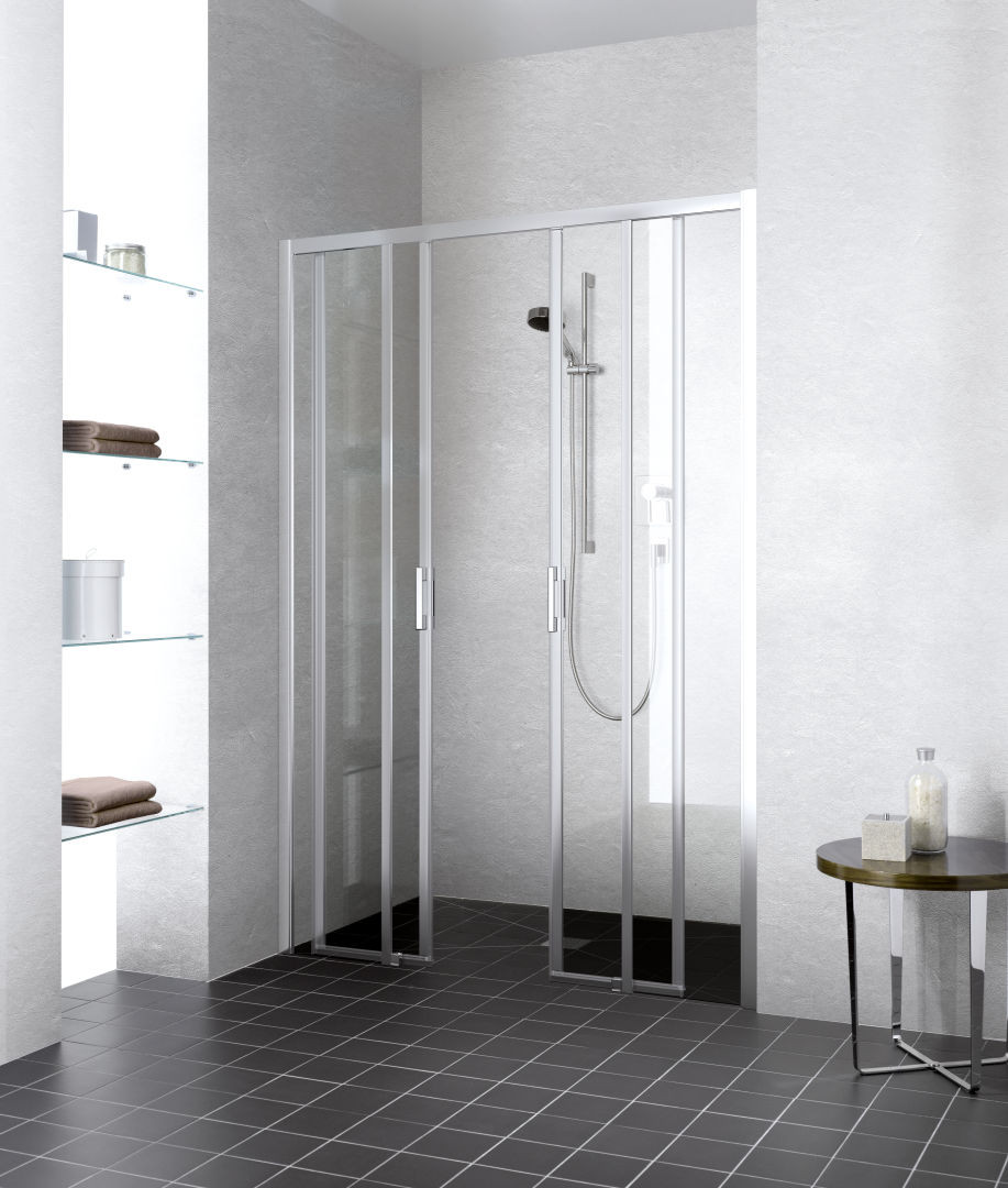 Kermi Gleittür LIGA 4-teilig bodenfrei mit Festfeldern 175 x 185 cm, silber hochglanz, ESG klar Clean, auf Duschwanne