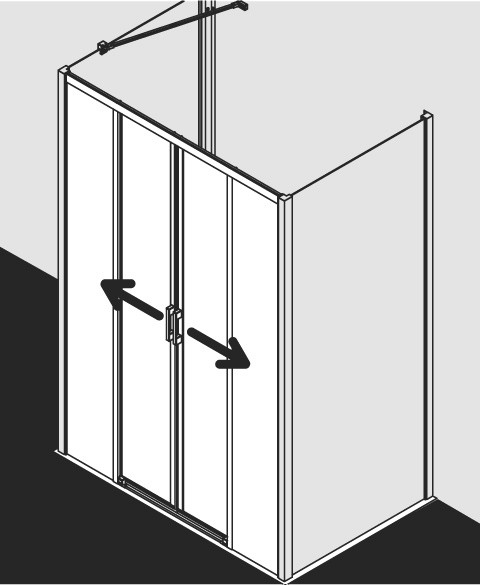 zum Einbau in einer Nische und zur Kombination mit LI TWD Seitenwand, teilgerahmte Tür mit zwei Gleittürsegmenten, je nach einer Seite öffnend, mit zwei Festfeldern, Verglasung mit 4 mm Einscheiben-Sicherheitsglas nach EN 12150, optional mit Pflegeleicht-Beschichtung, Profile aus eloxiertem Aluminium, Griffe aus Metall, bei Oberfläche silber mattglanz Griffe, Aushängemechanismus und Anschlüsse für Bodenschwelle in chrom, Verstellmöglichkeit je Wandprofil 25 mm, Gleittürsegmente zur Reinigung nach innen schwenkbar, kugelgelagerte Laufrollen, durchgehende Magnetleisten und Dichtprofile, waagerechte Dichtleiste mit Wasserabpralleffekt., mit Bodenschwelle (Höhe 6 mm) oder ohne Bodenschwelle (bodenfrei) installierbar, Befestigungsmaterial, geprüft nach DIN EN 14428, Schräge waagerecht max. 5 mm, andernfalls Montage nicht möglich