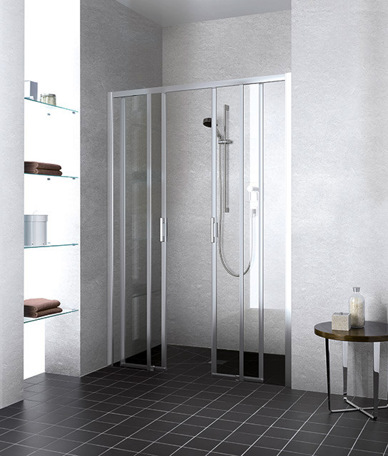 Kermi Gleittür LIGA 4-teilig bodenfrei mit Festfeldern 120 x 185 cm, silber hochglanz, ESG klar Clean, auf Duschwanne ZKLID4B12018VPK