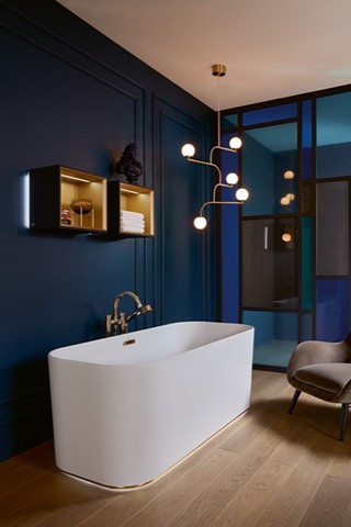 V&B Rechteck-Freistehwanne Finion Ausstattung Gold Quaryl, Push-to-Open-Ventil, Überlauf, Wasserzulauf, Ring, Emotion, stone white