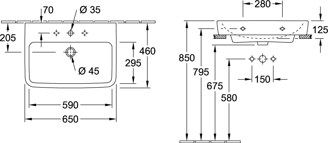 für 3-Loch-Armatur geeignet, mittleres Hahnloch durchgestochen, Rückseite und Unterseite geschliffen, Becken mittig, Wandbefestigung, mit Montageanleitung, mit Ausschnittschablone
