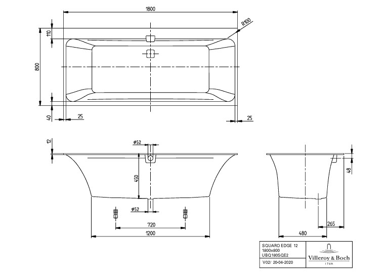 V&B Rechteck-Badewanne Squaro Edge 12 Duo 180 x 80 cm, weiß, Ablauf mittig, Quaryl ~~~