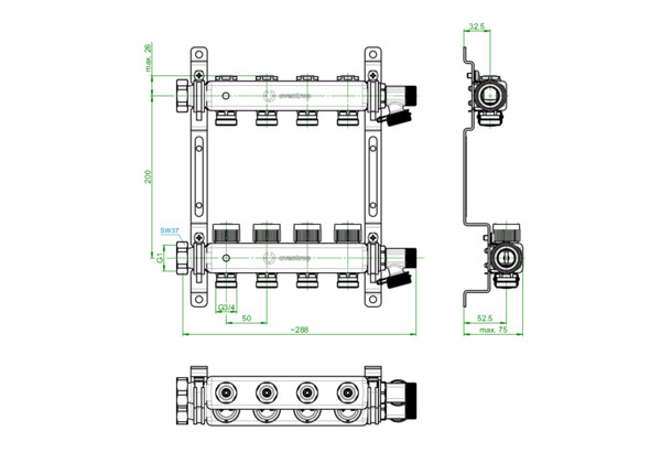 mit integrierten Reguliereinsätzen im Vorlauf, flachdichtend, mit Ventileinsätzen M 30 x 1,5, für Flächenheizung/-kühlung, max. Betriebsdruck 6 bar (PN 6), max. Betriebstemperatur 80 °C, Verteiler vormontiert, mit Füll-/Entleerungshähnen, Heizkreisanschlüsse mit 3/4 AG für Klemmringverschraubungen, Vorlaufbalken mit integrierten Reguliereinsätzen, Rücklaufbalken mit integrierten Ventileinsätzen, Verteilerhalterungen (lose beigelegt) mit Schalldämmung entsprechend DIN 4109