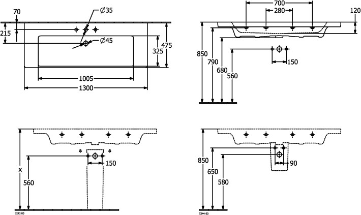mittleres Hahnloch durchgestochen, Wandbefestigung, bei Modellen ohne Überlauffunktion muss ein nicht verschließbares Ventil verwendet werden