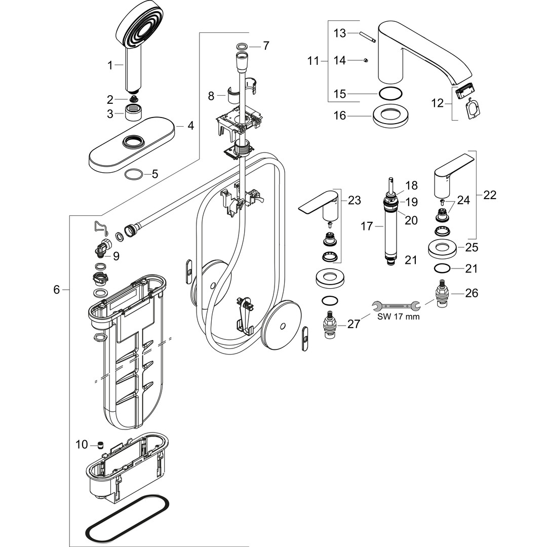bestehend aus: 4-Loch Wannenrandarmatur, Handbrause, Brausehalter, Brauseschlauch, Schlauchbox, 2 Verbraucher, Anschlussart Grundkörper, Strahlart Armatur WaterfallStream, Strahlart Handbrause PowderRain, max. Ausziehlänge Handbrause 145 cm, sBox für geschützte Schlauchführung, max. Durchflussmenge bei 3 bar 23,9 l/min, Durchfluss für Wanneneinlauf bei 3 bar 23,9 l/min, Durchfluss für Handbrause bei 3 bar 10,5 l/min, Betriebsdruck min. 1/max. 10 bar, Keramikventile heiß/kalt 90°, Rückflussverhinderer, Anschlussgröße DN 15, AirPower Technologie