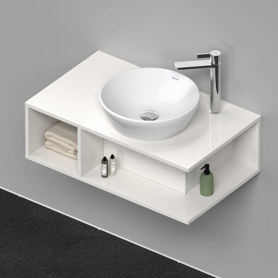 Höhe 26 cm, 1 offenes Fach seitlich links, 1 Konsolenplatte mit einem Ausschnitt, nur mit Raumsparsiphon montierbar