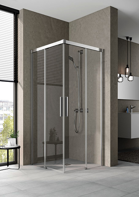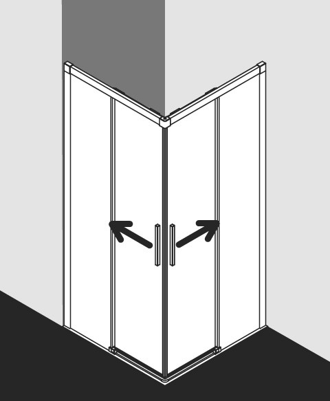 kompletter Eckeinstieg besteht aus NI C2R Eckeinstieg Halbteil rechts und NI C2L Eckeinstieg Halbteil links, Halbteile unterschiedlicher Breite beliebig kombinierbar, teilgerahmter Eckeinstieg mit zwei Gleittürsegmenten, je nach einer Seite öffnend, mit zwei Festfeldern, Verglasung mit 6 mm Einscheiben-Sicherheitsglas nach DIN EN 12150, optional mit Pflegeleicht-Beschichtung, Profile aus eloxiertem Aluminium, Griffe aus Metall, Verstellmöglichkeit im Wandprofil 25 mm, Gleittürsegment mit Soft-Open- und Soft-Close-Funktion, zur Reinigung nach innen schwenkbar, kugelgelagerte Laufrollen, durchgehende Magnetleisten und Dichtprofile, waagerechte Dichtleiste mit Wasserabpralleffekt, mit Bodenschwelle (Höhe 6 mm), mit Befestigungsmaterial, geprüft nach DIN EN 14428, Schräge unter dem Festfeld max. 2 mm Gesamtschräge max. 3 mm