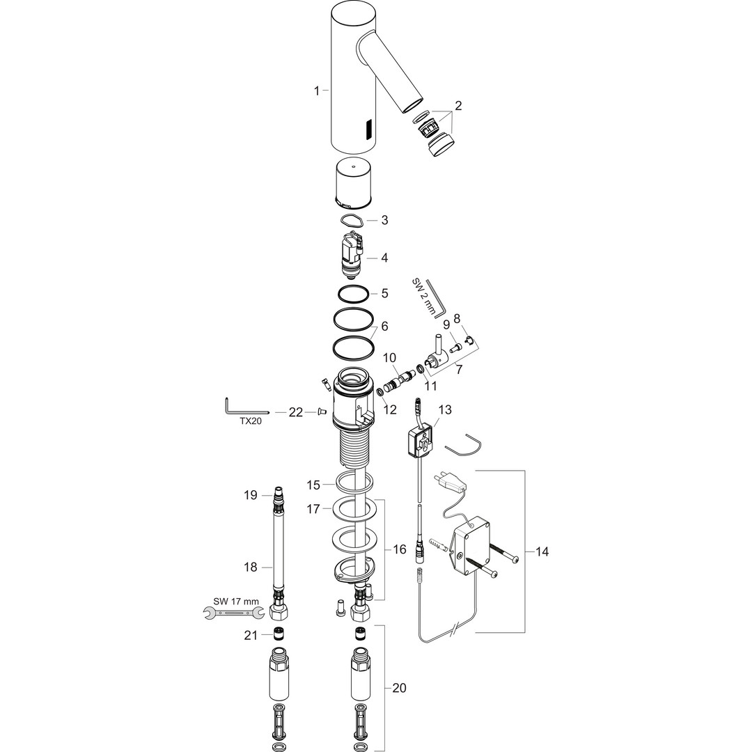 ComfortZone 90, Ausladung 103 mm, Normalstrahl, max. Durchflussmenge bei 3 bar 5 l/min, Temperatur einstellbar über seitlichen Mischhebel, für Durchlauferhitzer geeignet, Infrarot Näherungselektronik, automatische Umgebungsanpassung der Infrarotsensorik, Reichweite der Infrarotsensorik einstellbar (2 Einstellungen), 230 V/50 Hz Netzanschluss, Spülzeit 10 s, Hygienespülung aktivierbar (automatischer Wasserlauf), Frequenz Hygienespülung 24 h, Spülzeit Hygienespülung 10 s, Dauerspülung aktivierbar (einmaliger Wasserlauf für 180 Sekunden, geeignet zur thermischen Desinfektion), manueller Wasserstop zur Beckenreinigung, Anschlussart G 3/8 Anschlussschläuche, Anschlussgröße DN15, Schmutzfangsiebe in den Anschlussschläuchen, AirPower Technologie, EcoSmart, Quick Clean Antikalksystem