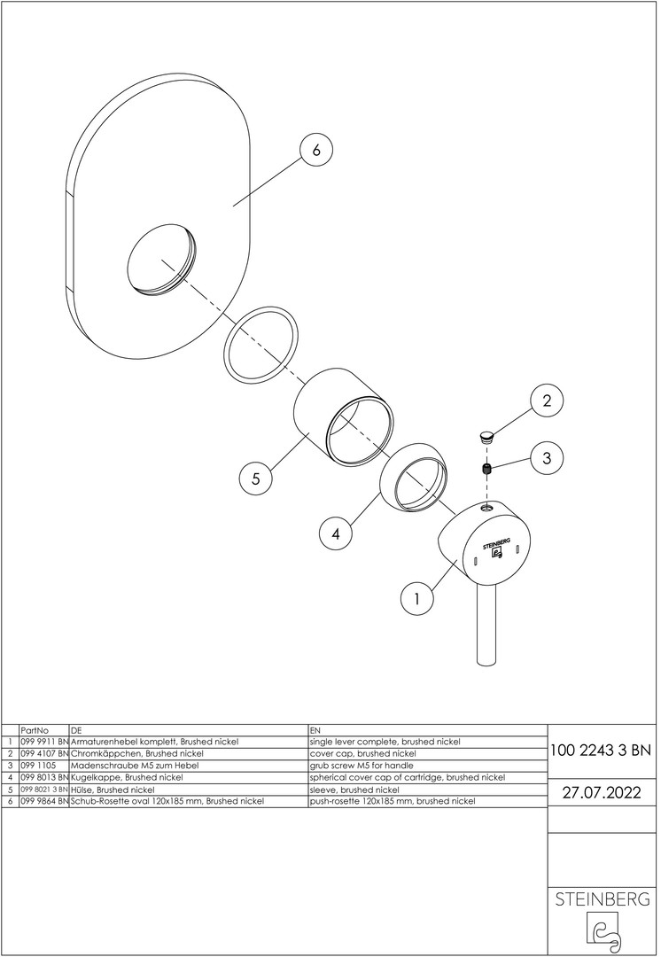 Steinberg Fertigmontageset Serie 100 für Wanne/Brause-Einhebelmischer, brushed nickel ST10022433BN