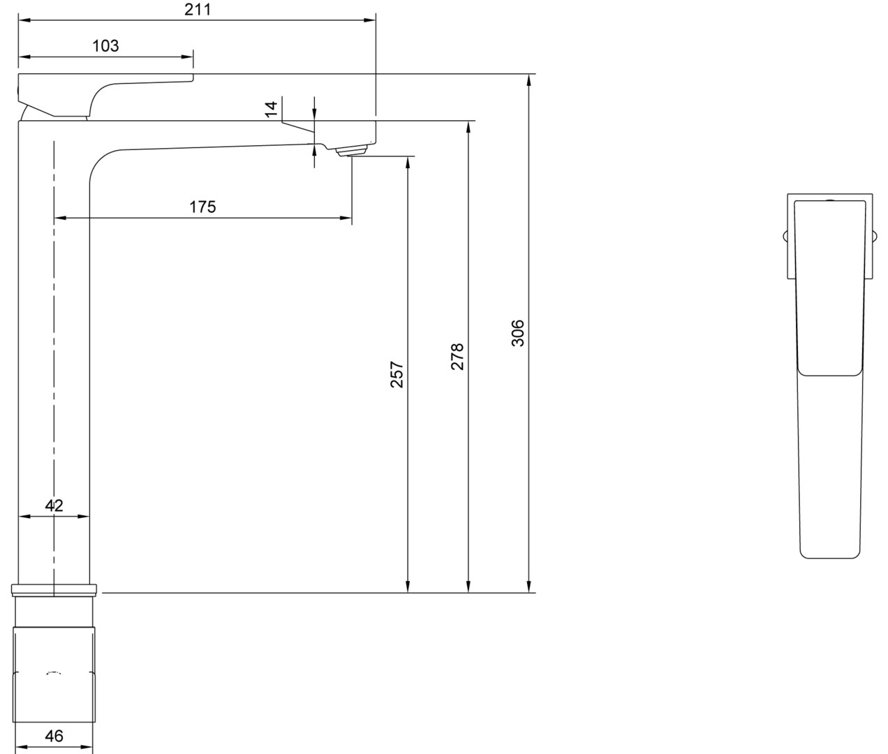 50 x 306 x 211 mm, eckig, Material aus Messing, Standmontage, maximale Durchflussmenge bei 3 bar 4,9 l/min, Auslauflänge 176 mm, Auslaufhöhe 258 mm, Anschlusstyp 3/8''