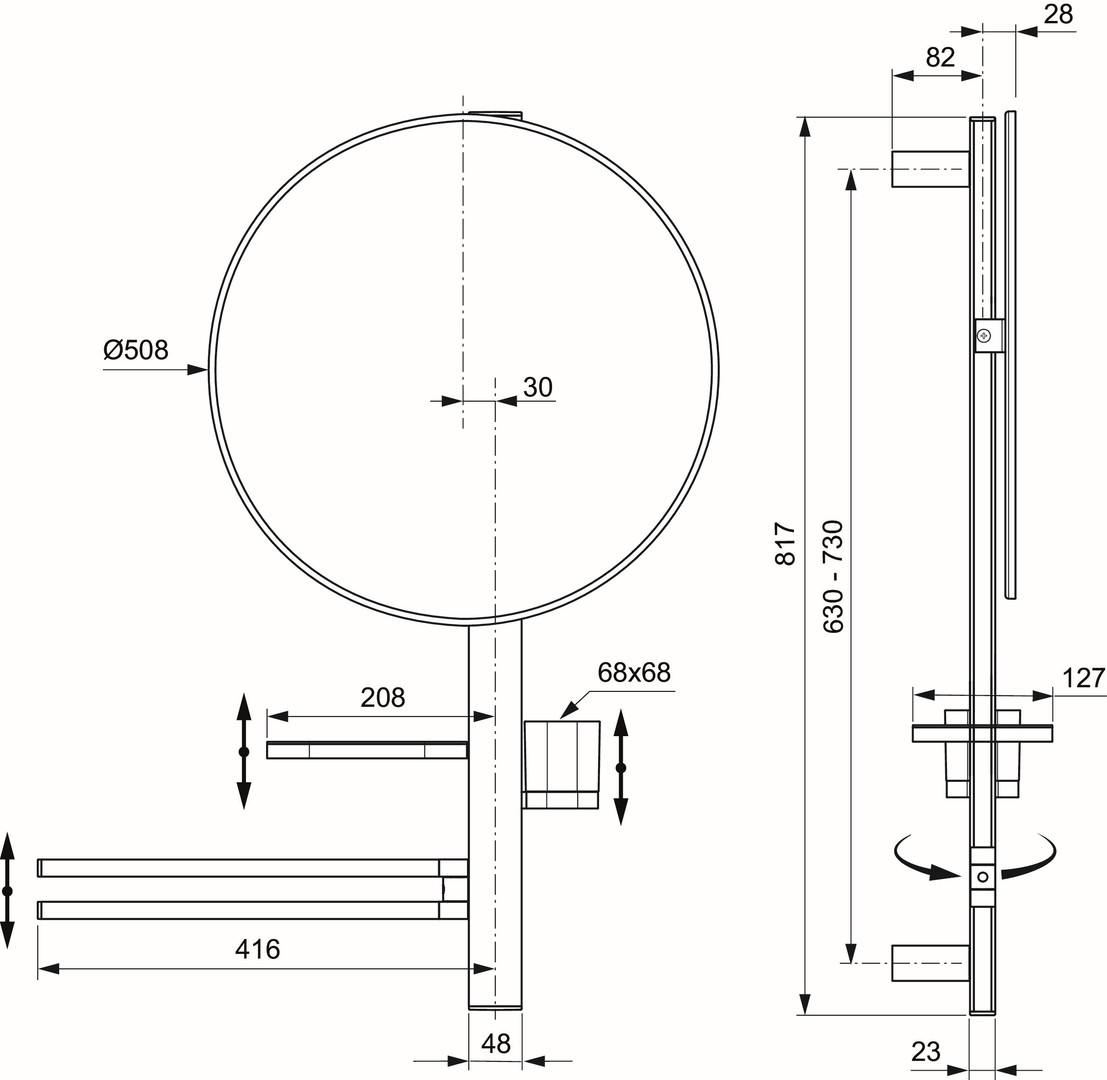 Beauty Bar, Accessoires-Kombination L, Aluminium-Wandstange 817 mm mit höhenverstellbarer Wandhalterung, Ø 508 mm Kosmetikspiegel, doppelter Handtuchhalter 90° schwenkbar, Ablage mit Halterung, Einsatz herausnehmbar, Becher mit Halterung, herausnehmbar, Handtuchhalter, Ablage und Becher lassen sich links und rechts individuell in unterschiedlichen Höhen montieren, mit Befestigungssatz, Gewicht 4,528 kg