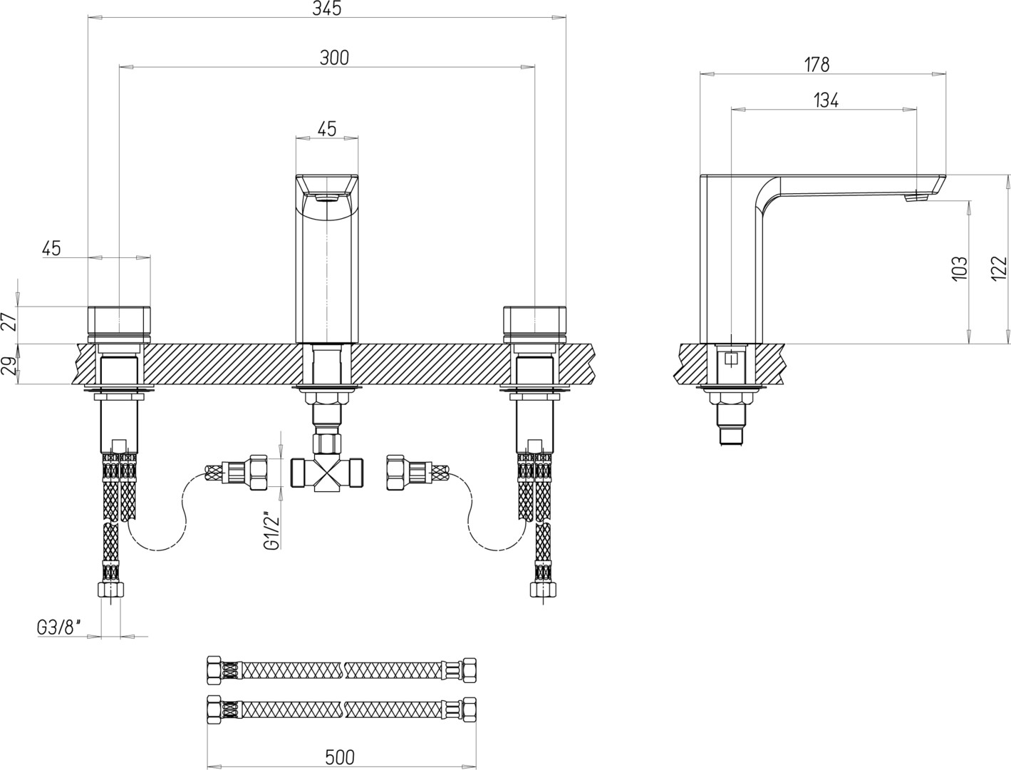 345 x 122 x 178 mm, Eckig, Standmontage, Kippen, Material aus Messing, Standmontage, Anschlusstyp 3/8'', mit verstellbarem Strahlregler, maximale Durchflussmenge bei 3 bar 3,8 l/min, Auslauflänge 134 mm, Auslaufhöhe 103 mm