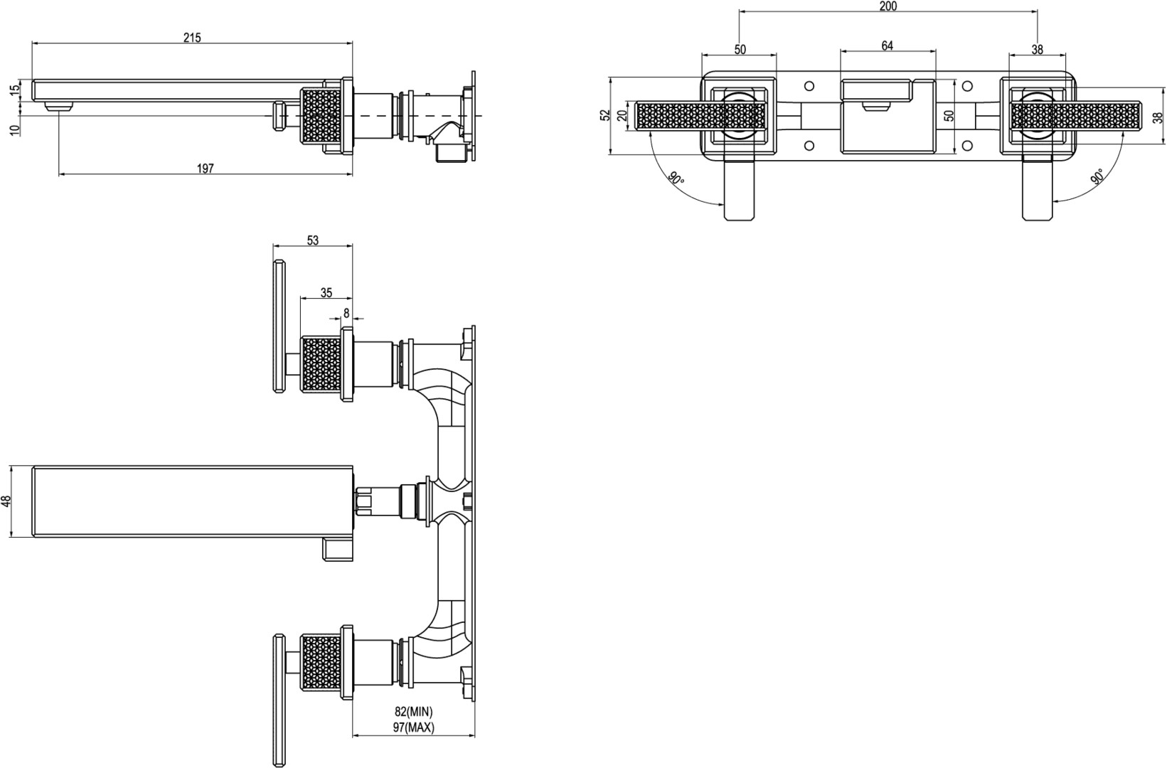 340 x 53 x 215 mm, Eckig, Kippen, Material aus Messing, Anschlusstyp 3/8''