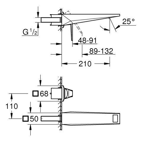 Wandmontage, (ohne UP-Einbaukörper), Fertigmontageset für 23 200 002, Long-Life Oberfläche, Water Saving weniger Wasser, max. 5 l/min, Auslauf mit integriertem Mousseur, Stichmaß 110 mm, Ausladung 210 mm