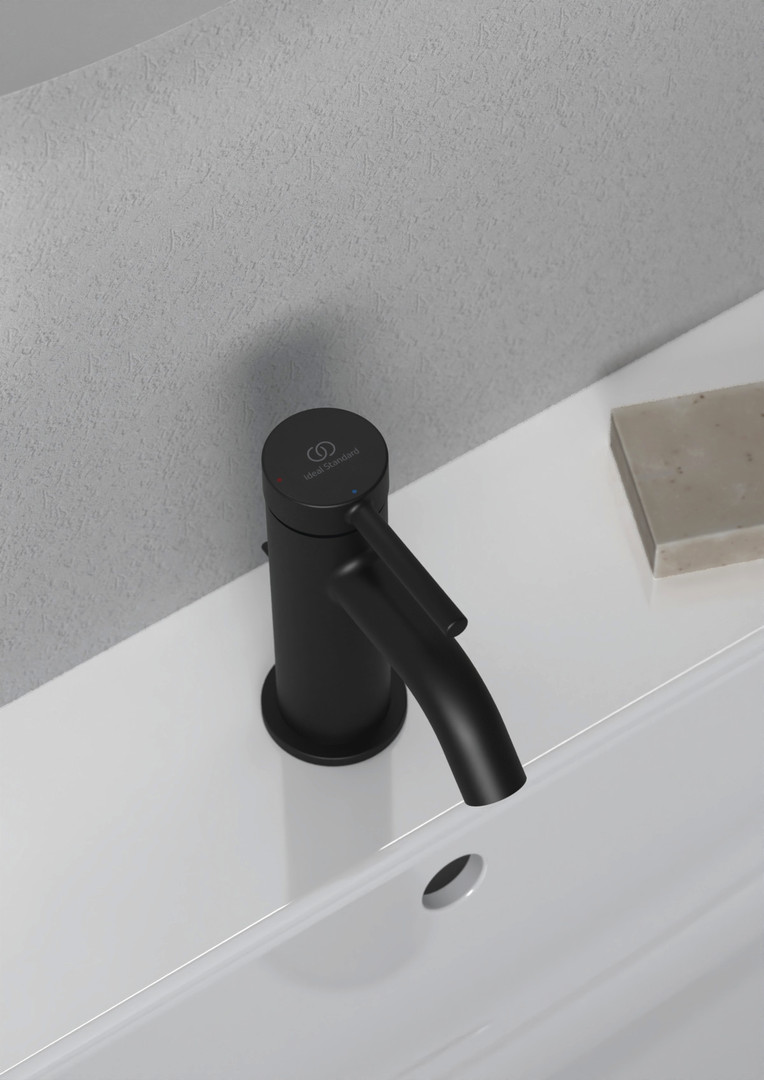 Ideal-Standard Waschtisch-Einhebelmischer Ceraline Nuovo H65 Ausladung 90mm, BlueStart, mit Metall-Ablaufgarnitur, silk black