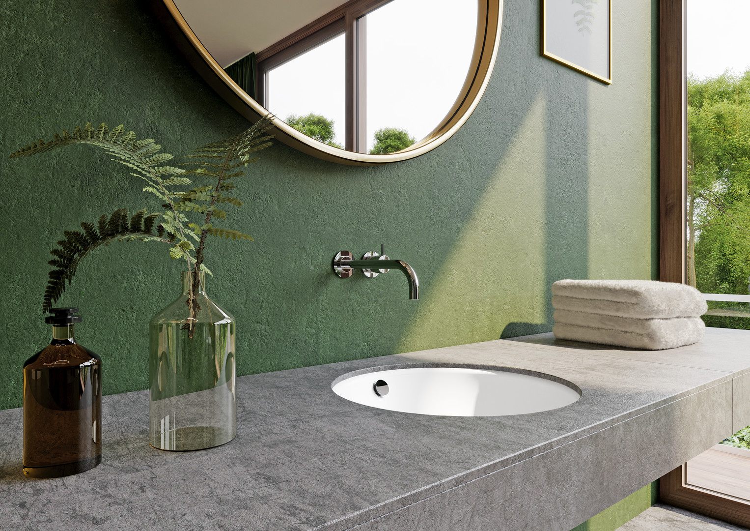 Außenform rund, Tiefe 157 mm, Stahl-Email Waschtisch, Kaldewei Stahl-Email, mit pflegeleichter Perl-Effekt-Oberfläche, mit Schallschutz, mit Überlaufloch, Gewicht 7,3 kg, Basisfarbe alpinweiß, zertifizierte Oberfläche kratz- und schlagfest, chemikalienresistent, hitzebeständig, UV beständig, nachhaltig, formstabil, hygienisch