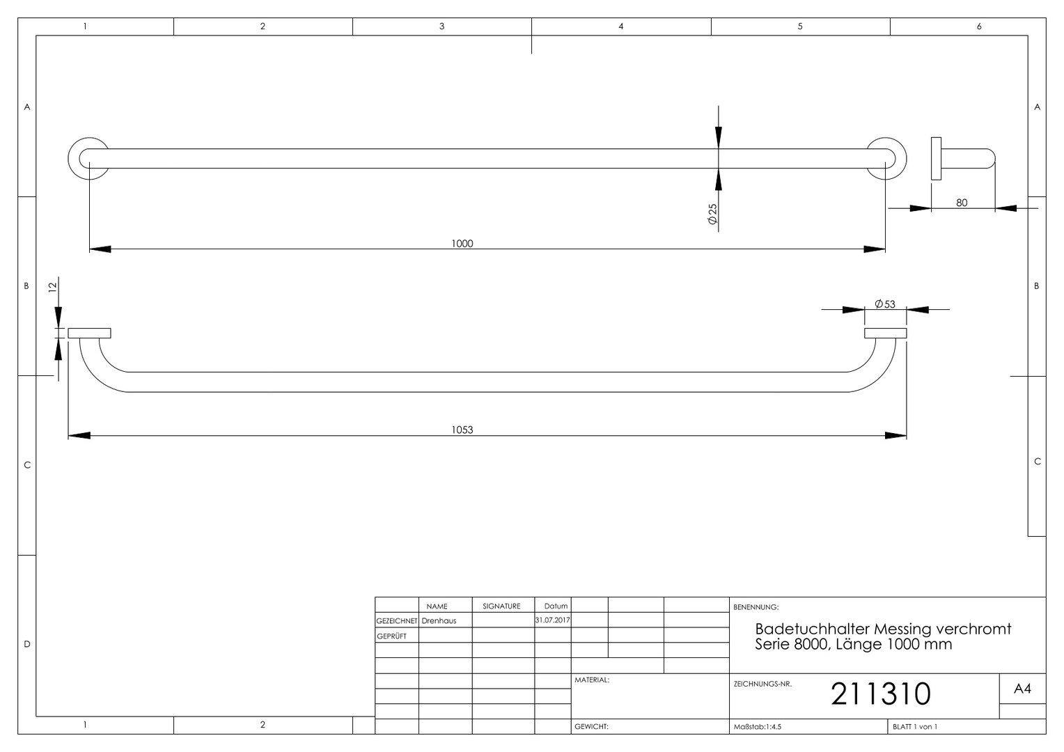 ASW Badetuchhalter Serie 8000 Messing verchromt, Länge 800 mm, 1-fach FC211298