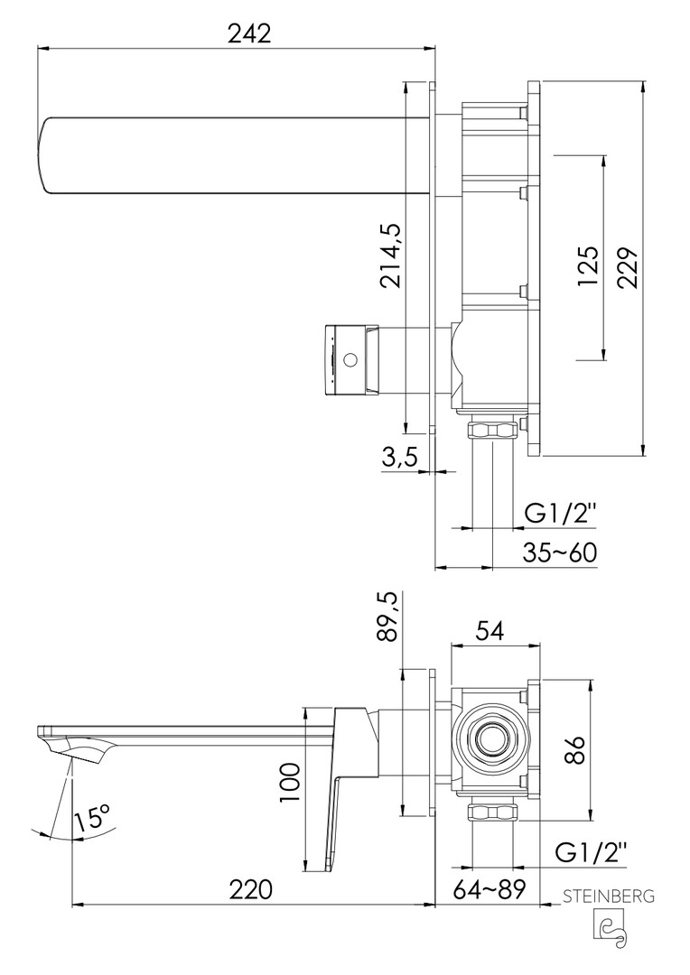 Steinberg Fertigmontageset Serie 342 UP-Waschtisch-Einhebelmischer, Ausladung 220mm, Wandmontage, chrom ST34218643