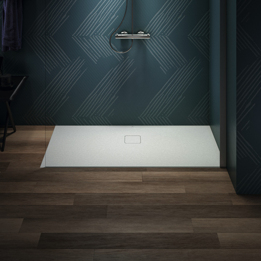 Sanitär-Acryl mit Polymer-Mineralgusskern, mit Ablaufabdeckung aus lackiertem Edelstahl, bodenebener Einbau möglich, geeignet zur Montage direkt auf den Estrichaufbau, Antirutsch-Oberfläche nach DIN EN 51097/Klasse C, plangeschliffener Unterbau, Position Ablaufloch Mitte Längs/Querseite, Norm DIN EN 14527, DIN EN 251, DIN EN 51097 Klasse C