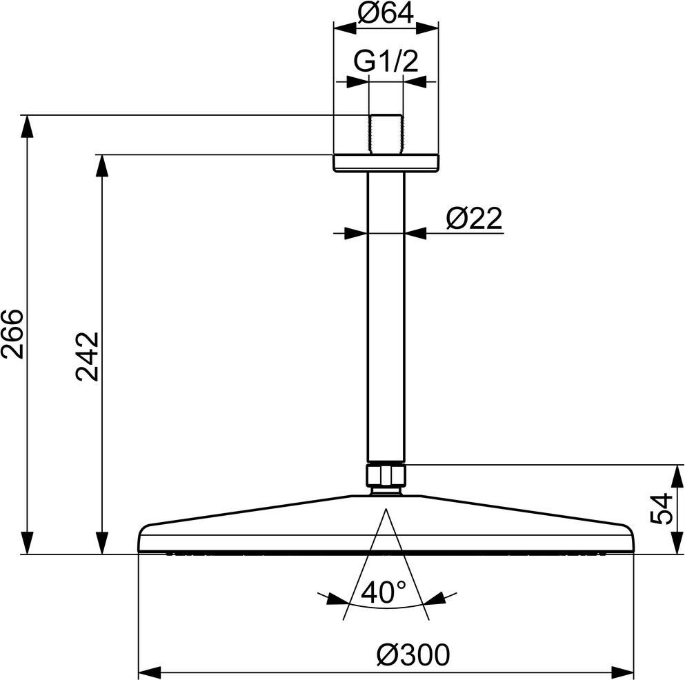 Heißwasserversorgung max. 65°C, Arbeitsdruck 0,5-5 bar, Durchfluss bei 3 bar (mit Begrenzer) 12 l/min, Anschlussgröße G1/2, Kopfbrausengröße Ø 300 mm, Sicherungseinrichtung (EN1717) EB, Geräuschklasse I (ISO 3822), Material Messing/Verbundwerkstoff, Kopfbrause, schwenkbares Kugelgelenk, Anti-Kalk-Technik Außengewinde, Abdeckung(en), 1-strahlig