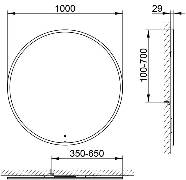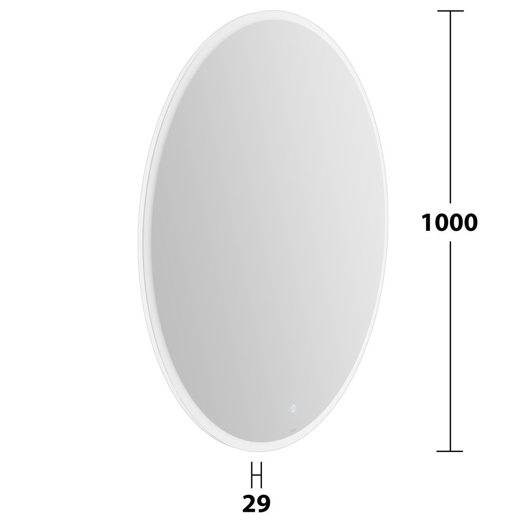 Schutzart IP 44, umlaufender Lichtleiter: Glas satiniert, kapazitiver Touch-Sensor in Spiegel, Einstellungen ein- / ausschalten, Einstellen der Lichtfarbe, Steuerung über Raumschalter möglich, Beleuchtung 2700 Kelvin (warmweiß) bis 6500 Kelvin (tageslichtweiß), umlaufend, indirekte Wandbeleuchtung, LED, Spiegelheizung mittig des Spiegels platziert, permanent in Betrieb, wenn Beleuchtung eingeschaltet ist